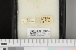 Here is a queue of pallets carrying beetle specimens. Two shots will be made: one of the beetle from above and another from a diagonally placed camera of the beetle and the labels left intact on the pin. Underside of the labels is captured through a mirror on the pallet, and flipped to normal view in post-processing of the image. Only the unique ID with QR-code (at right) needs to be attached after the imaging.